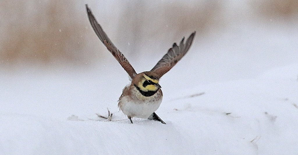 In theory, you might see a horned lark here in the warmer months, but they breed high in the Arctic, returning to our grasslands with the cold and snow. I don't know about you, but hearing the sweet song of the horned lark floating on the chilled air warms my heart.